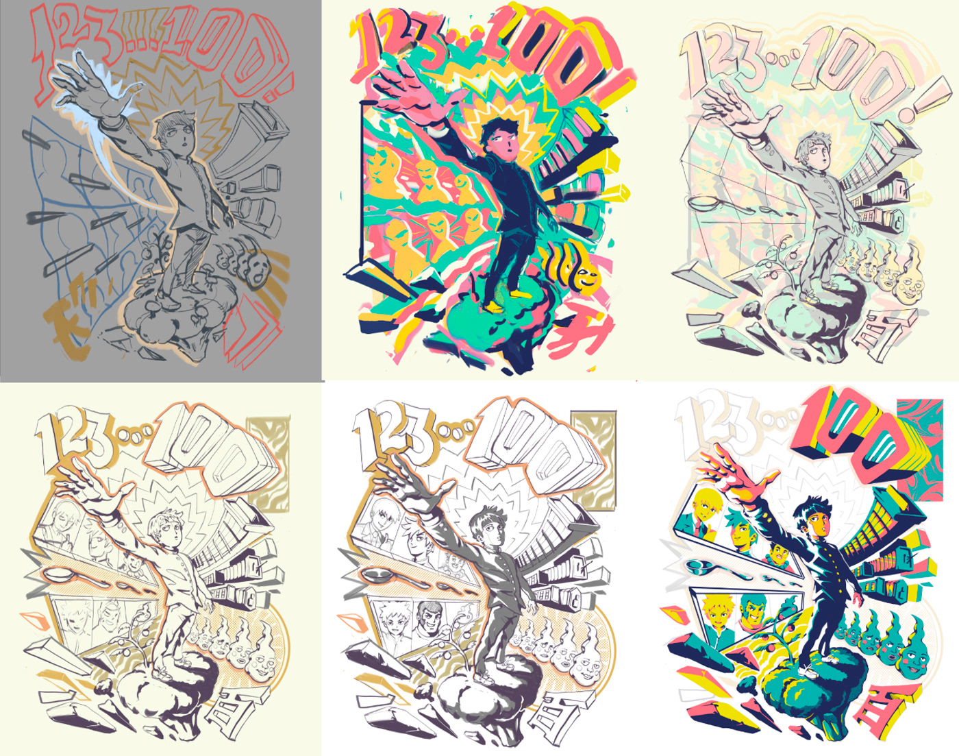 We are big fans of the anime Mob Psycho 100. So we tried to pay it homage doing this fanart. We explored the psychedelic aesthetic of the show in this 4 colors illustration. The main challenge here was the limited number of colors. We wanted to have an over-information piece, but at the same time not confuse. We hope you all enjoy it.