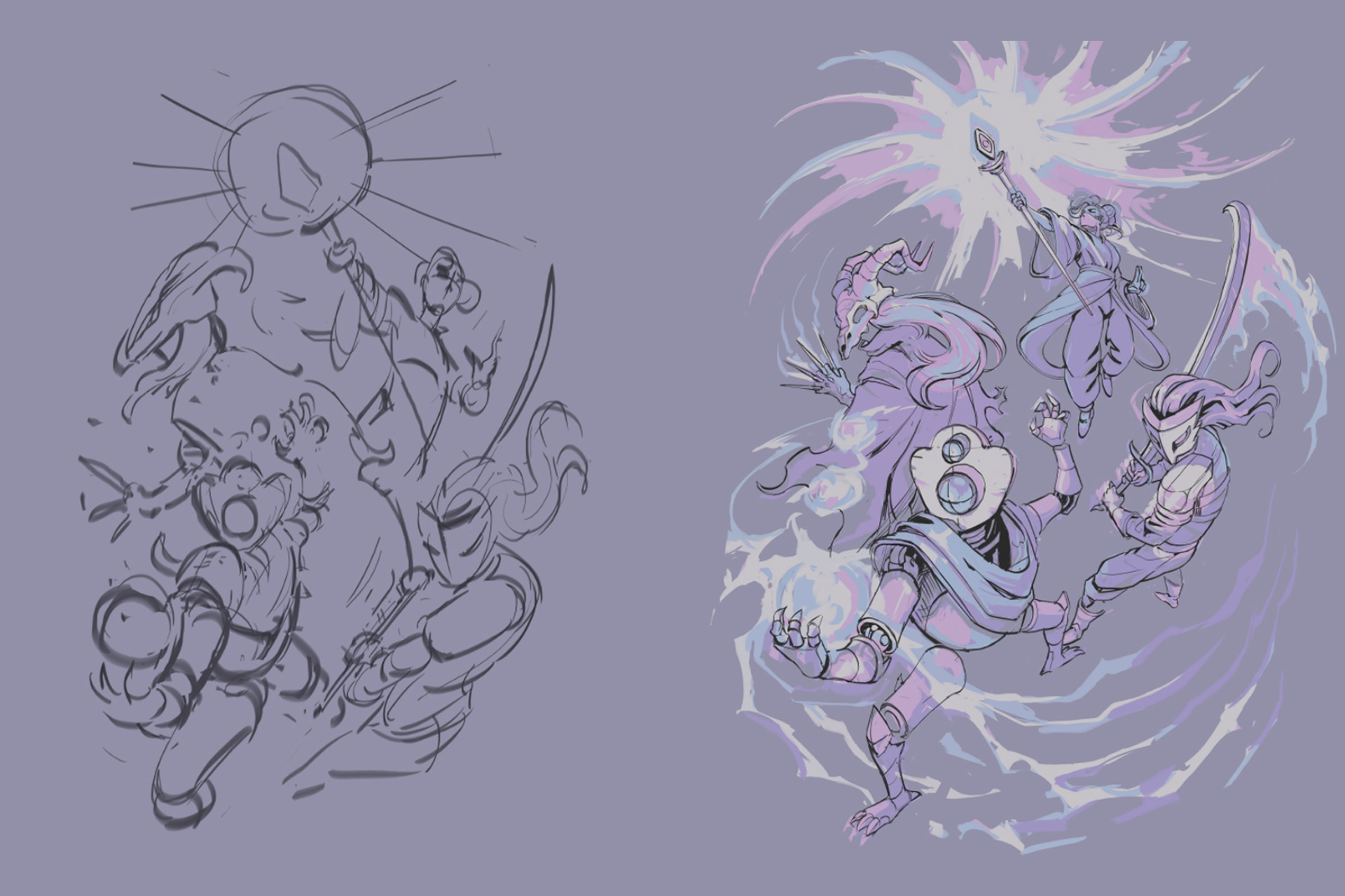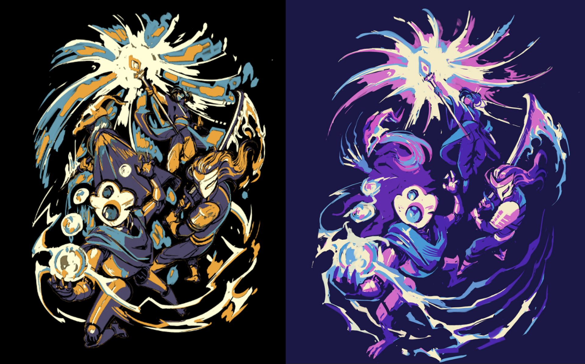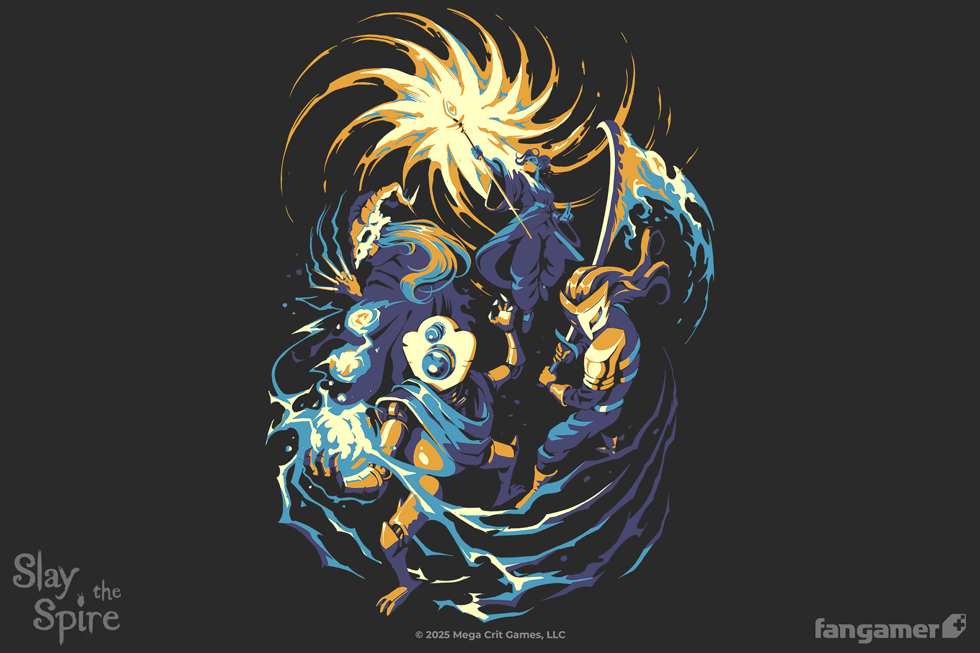 We created this official Slay the Spire T-shirt design for Fangamer, featuring all the game's playable characters. Respecting the color palette limitation of 4 colors, we could create an energetic and dynamic composition.