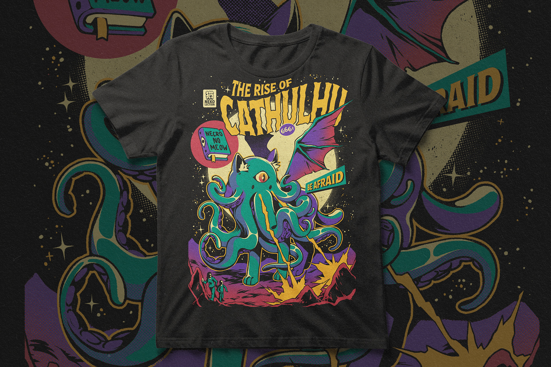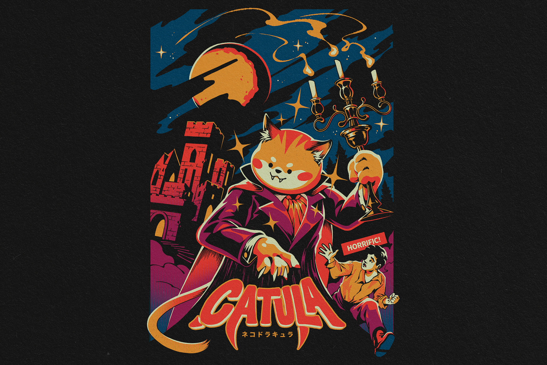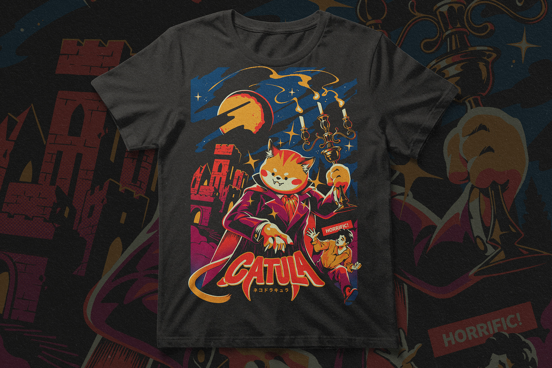 This is a collection of original characters t-shirt of ours. We love to play with animals (especially cats) and spooky/horror themes with a vintage twist. These design products can be found in a wide variety of products, including apparel, home decor, and more, at our Redbubble store and in licensed stores.